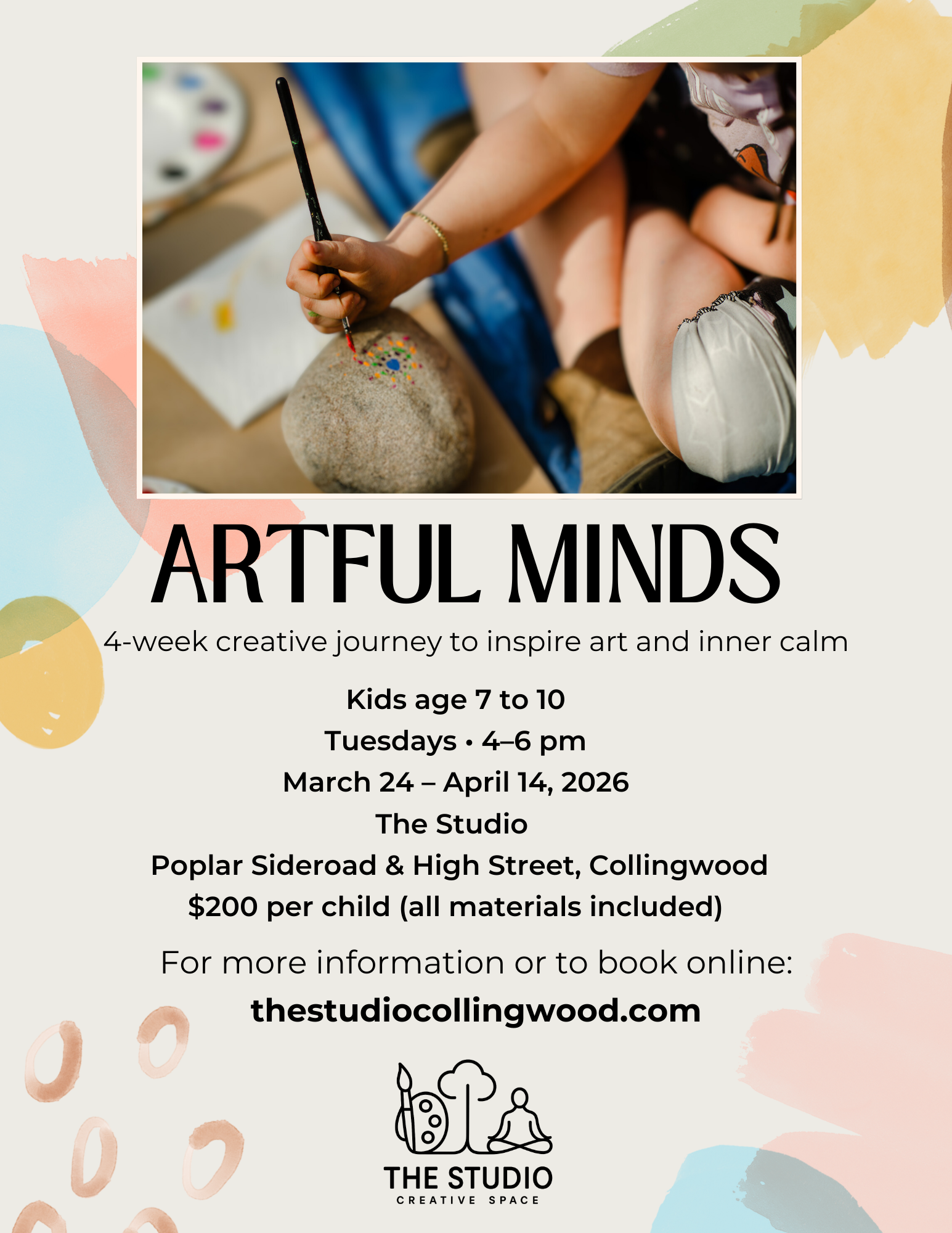 Artful Minds is back again! This spring at The Studio every Tuesday from 4-6pm, between March 24 to April 14. This 4-week creative workshop is designed for kids ages 7-10 and blends art, mindfulness, and movement to support self-expression, confidence, and meaningful connection in a nurturing environment.