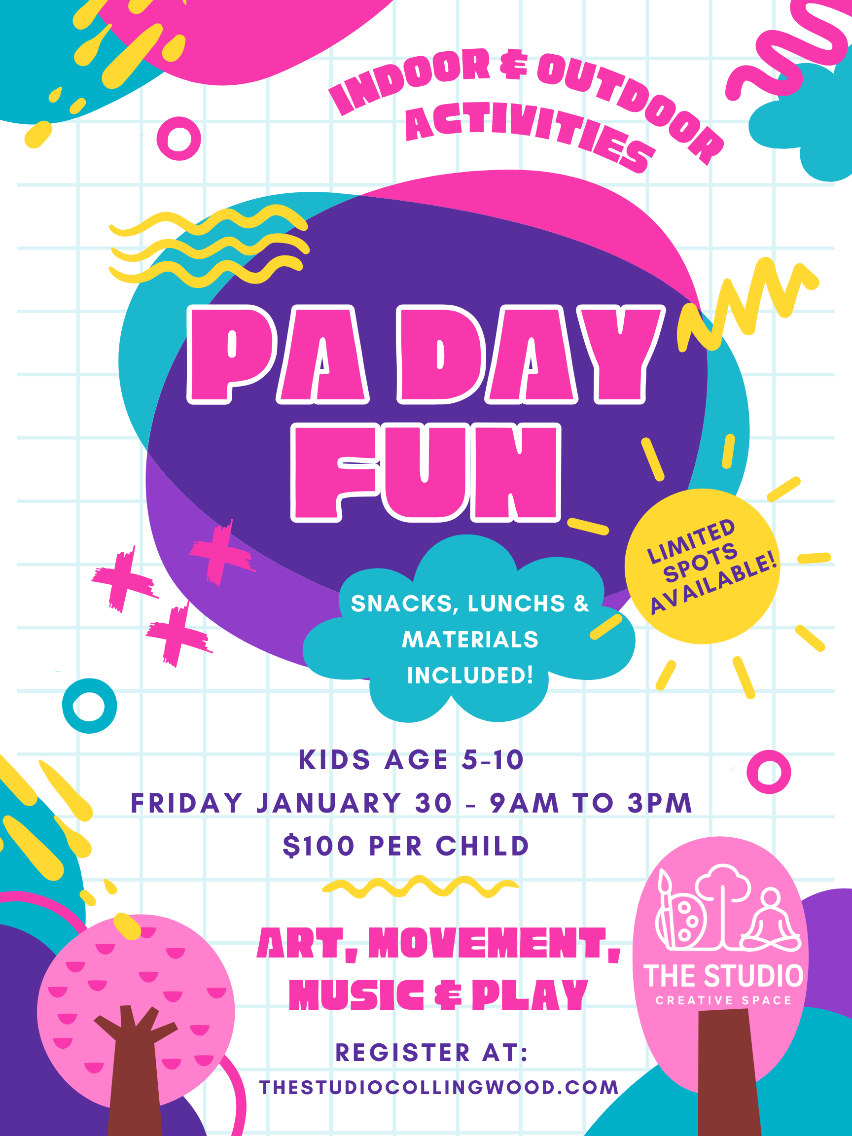 PA Day Fun at The Studio is a full day creative camp for kids ages 5-10 who love to create and move. We will spend time indoors as well as outdoors in nature.