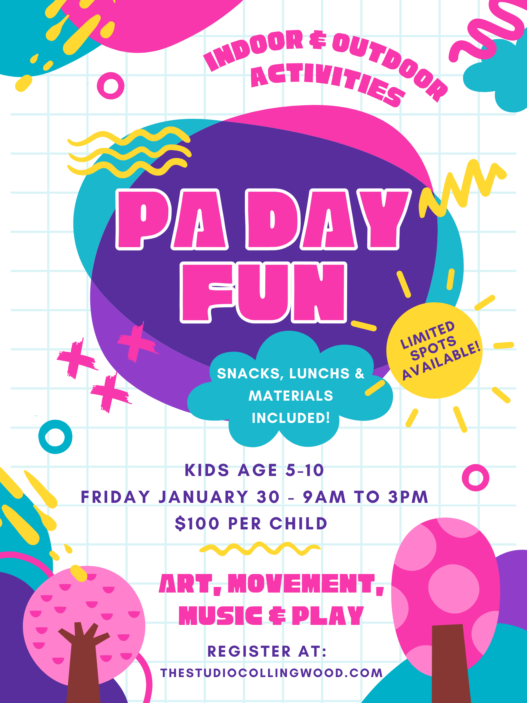 PA Day Fun at The Studio is a full day creative camp for kids ages 5-10 who love to create and move. We will spend time indoors as well as outdoors in nature. Our day is filled with art-making, movement, and play all in a fun, supportive environment.